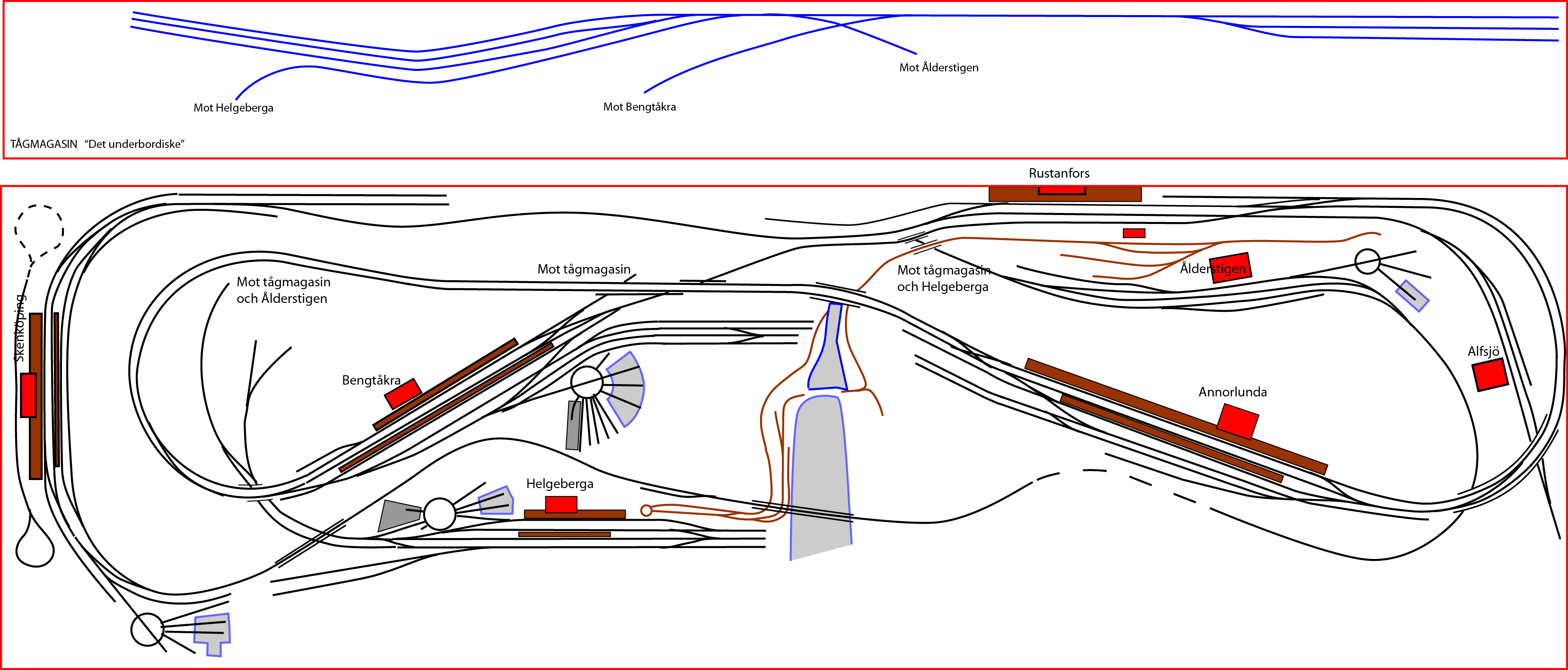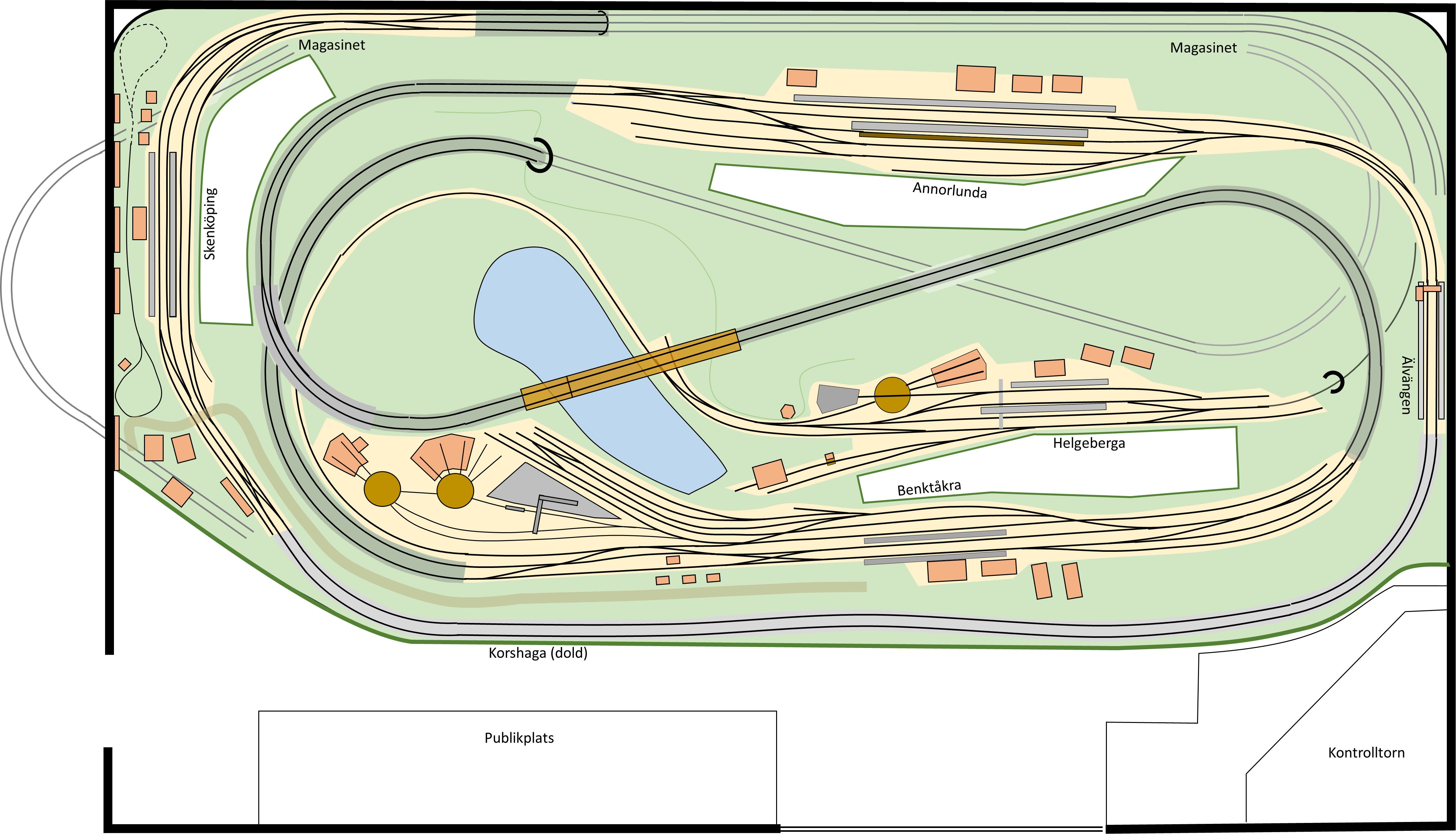 | Det skiljer omkring 50cm i höjd mellan anläggningens lägsta punkt som utgörs av tågmagasinet längs bakre väggen (syns ej i skissen ovan) och Annorlunda station, som är högsta punkten. |